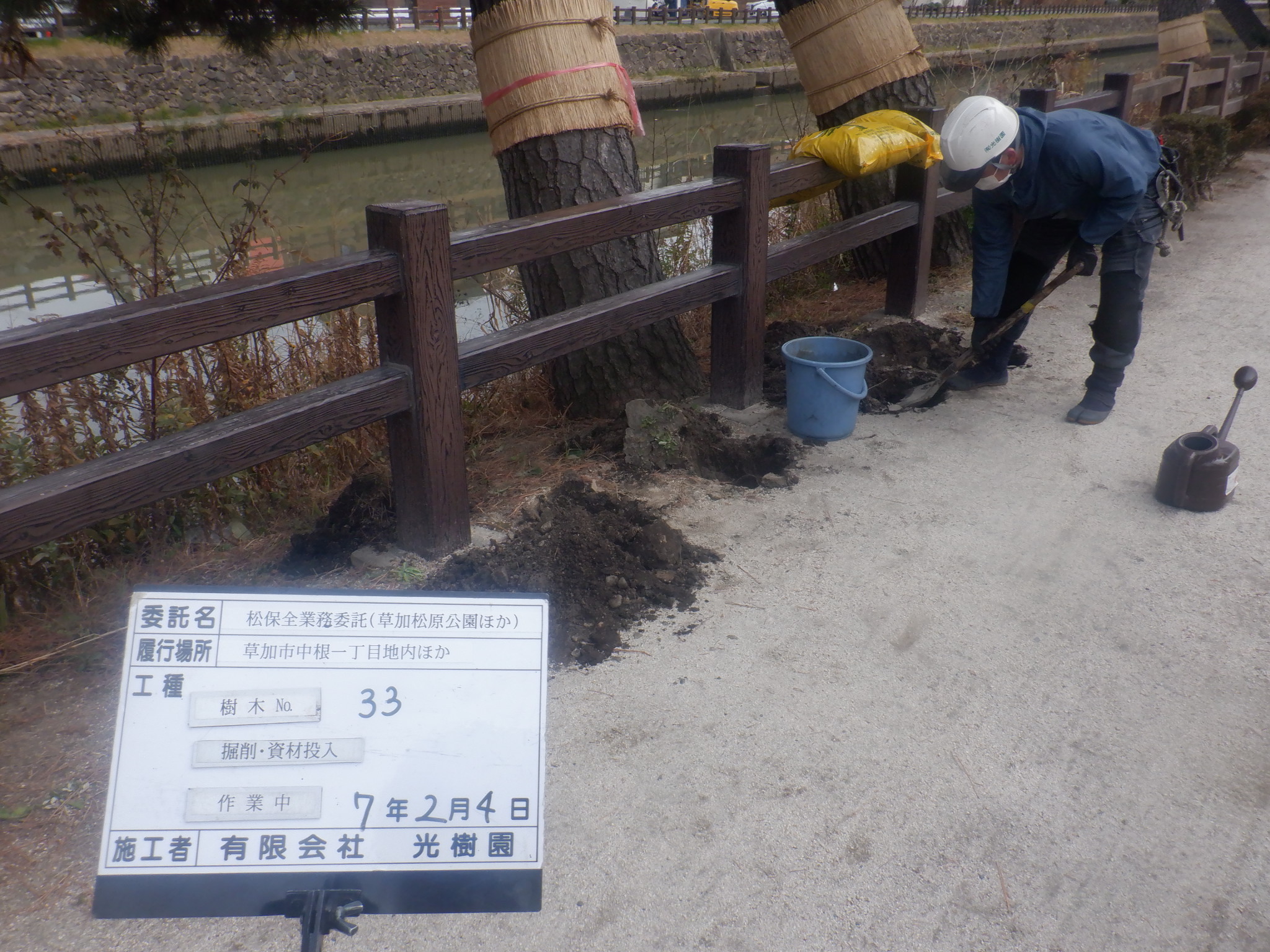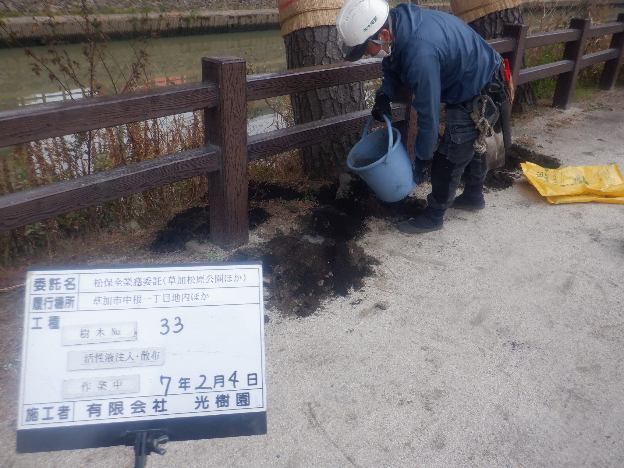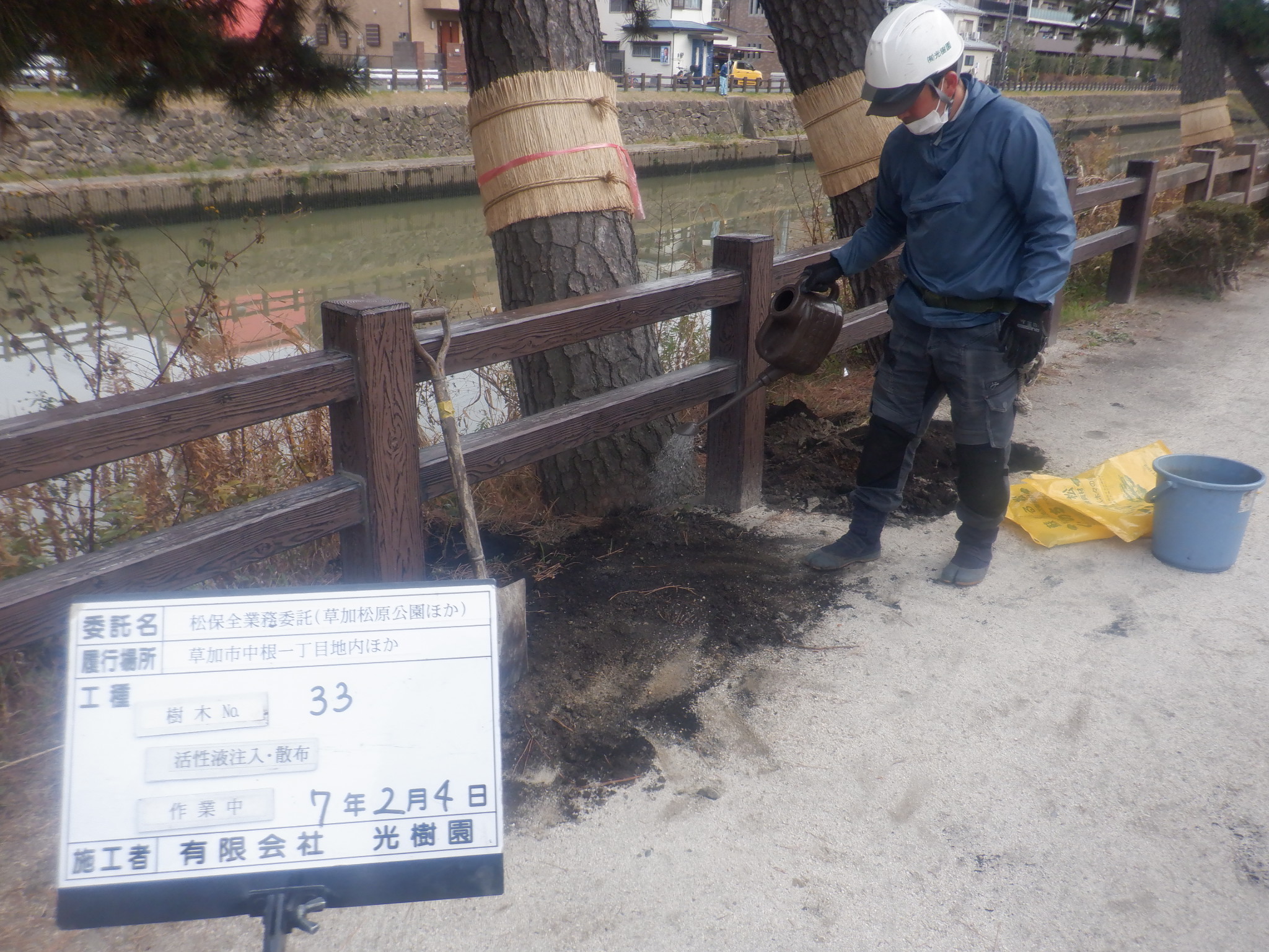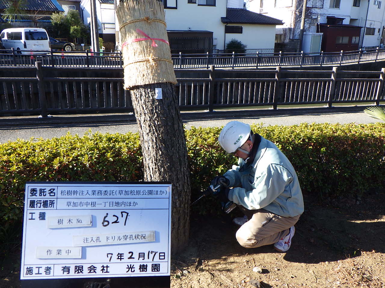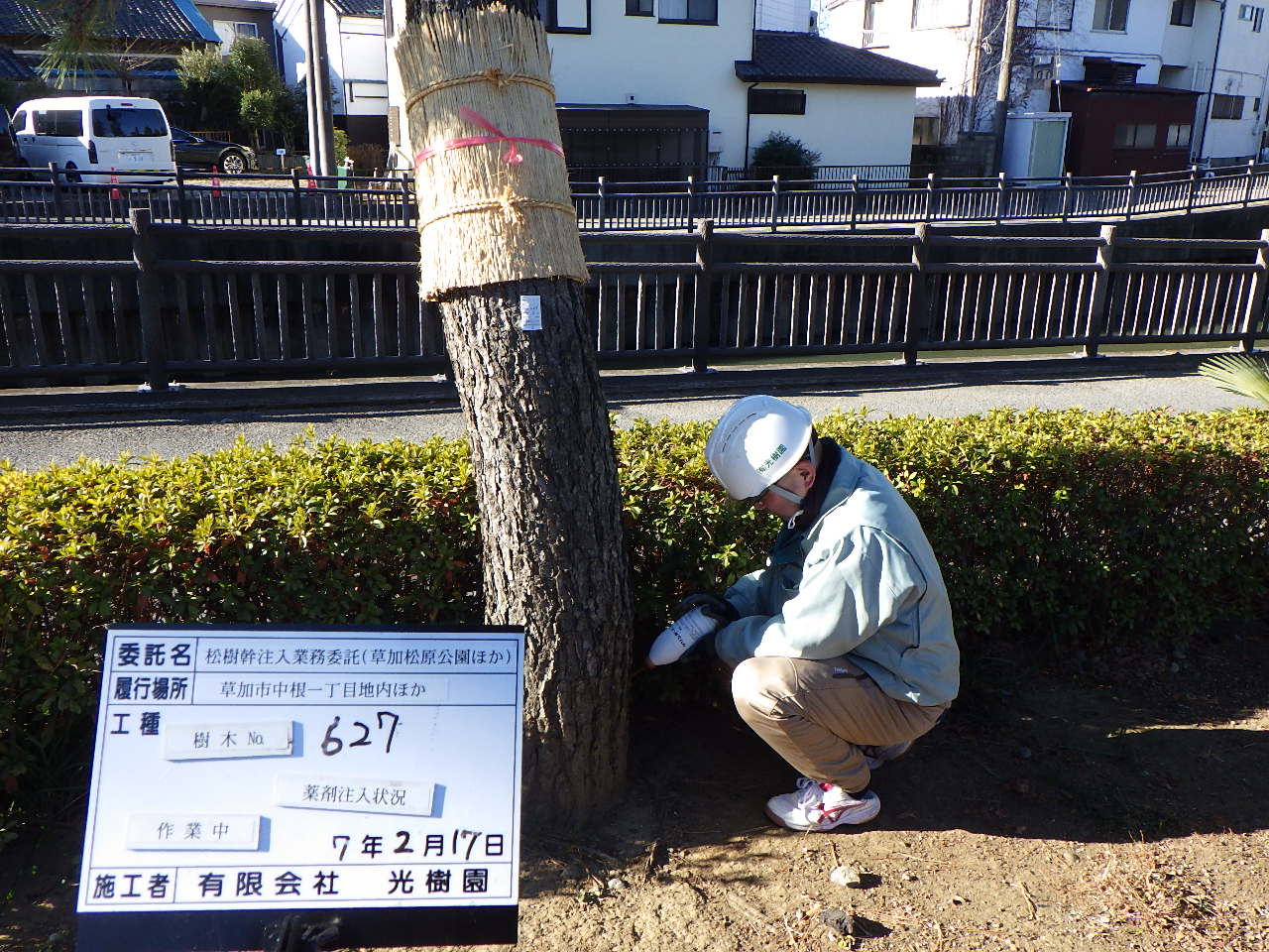 近年、松くい虫による松枯れの被害が全国各地で問題となっています。私たちにとって身近な樹木・松を、松枯れ被害から防ぐため、松枯れの原因となるマツ材線虫病の犯人、マツノザイセンチュウの侵入・増殖を防止する、予防薬剤の樹幹注入作業を実施しました。