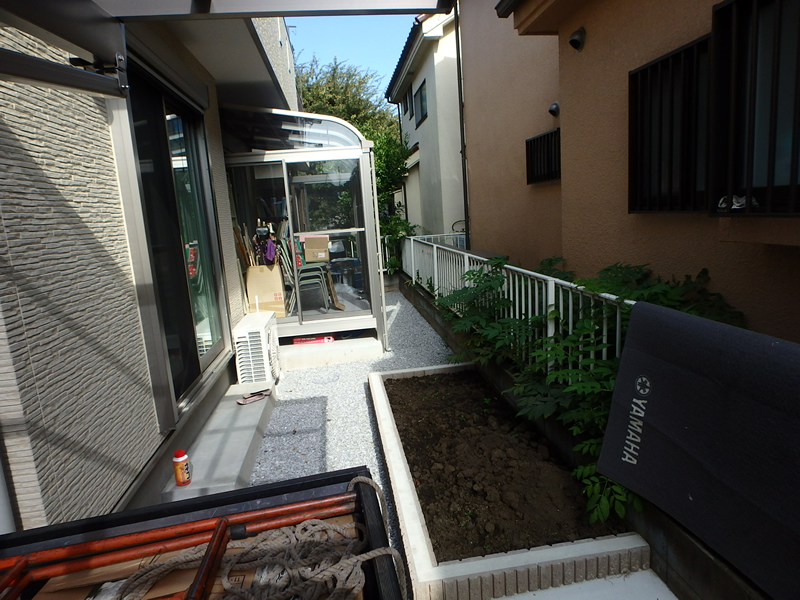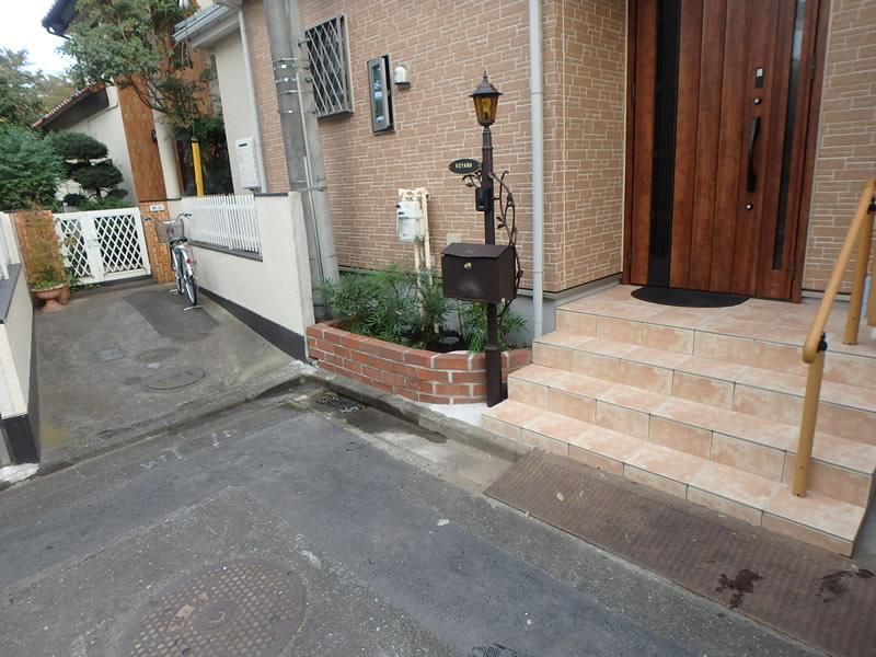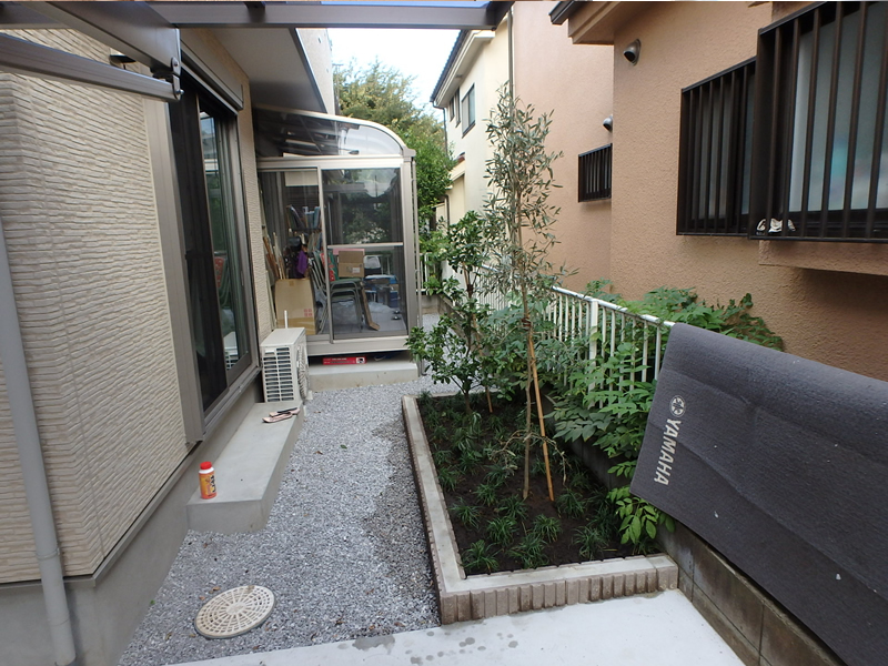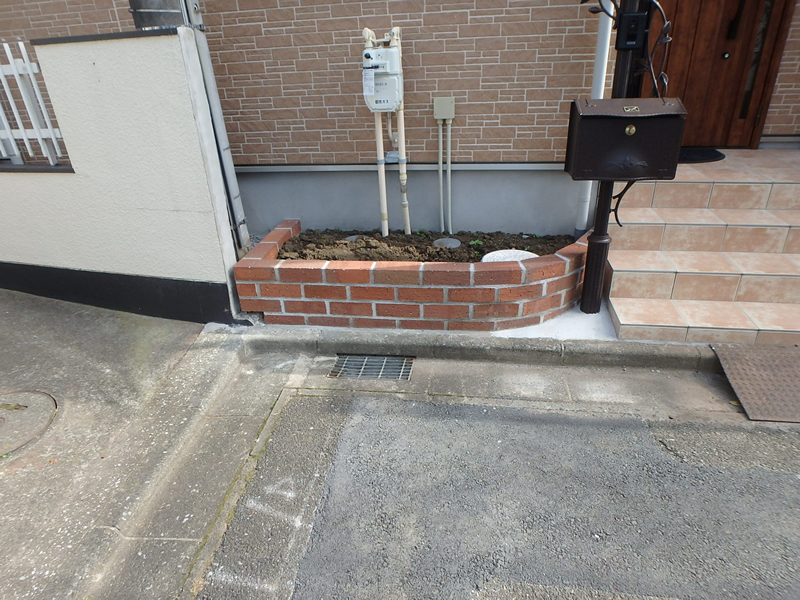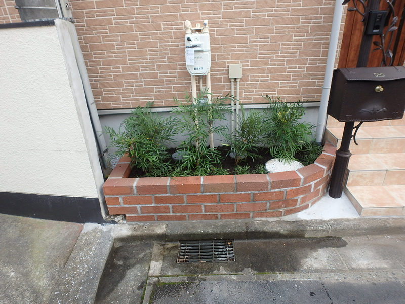 花壇の植栽を請けたまわりました。 施主様のご意向としまして、実のなる木・目隠しになる木との事でした。庭側花壇にキンカン・オリーブを植えて、間にマンリョウを植え地被類にリュウノヒゲを植えました。玄関わきの花壇は配管や枡が多く、中高木の植栽は困難な為、ヤナギバヒイラギナンテンを植え、手前にリュウノヒゲを植えました。
