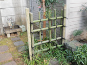 四つ目垣は、古くから広く用いられた竹垣で、透かし垣の代表。唐竹を縦横に組んだだけの、簡単な垣根であるが、それだけに意外ときれいに仕上げるのが難しい。